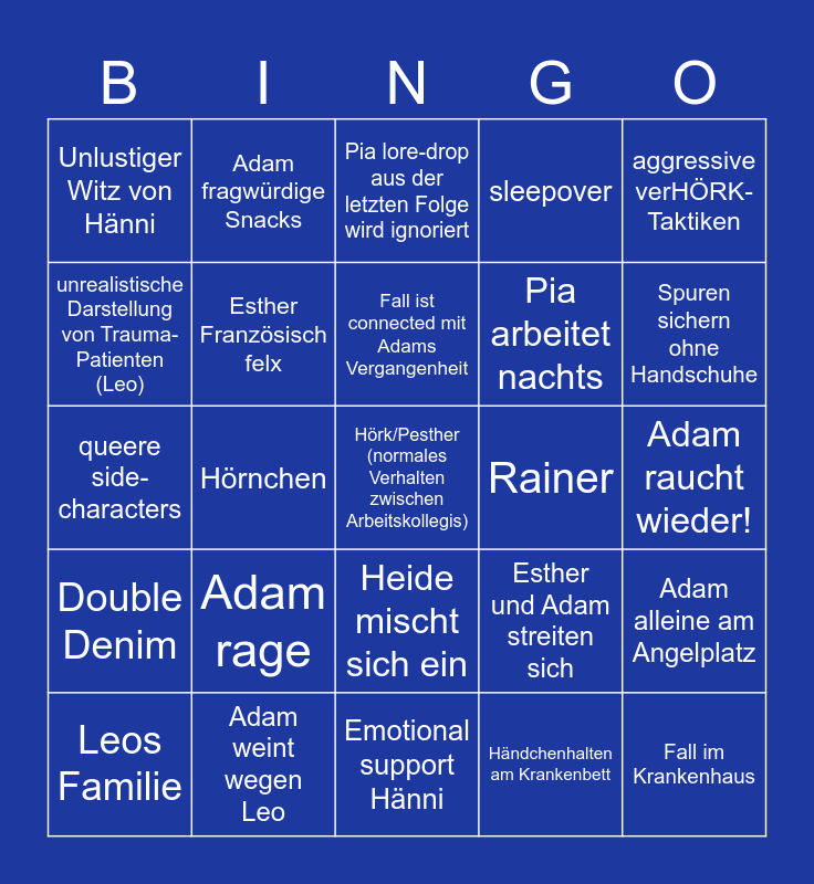 This bingo card has a free space and 24 words: Adam rage, Adam weint wegen Leo, Fall ist connected mit Adams Vergangenheit, Leos Familie, aggressive verHÖRK-Taktiken, Unlustiger Witz von Hänni, unrealistische Darstellung von Trauma-Patienten (Leo), Adam fragwürdige Snacks, Rainer, Heide mischt sich ein, Pia arbeitet nachts, queere side-characters, Esther und Adam streiten sich, Adam alleine am Angelplatz, Esther Französisch felx, Händchenhalten am Krankenbett, Adam raucht wieder!, Pia lore-drop aus der letzten Folge wird ignoriert, Spuren sichern ohne Handschuhe, Hörnchen, Fall im Krankenhaus, Double Denim, sleepover and Emotional support Hänni.