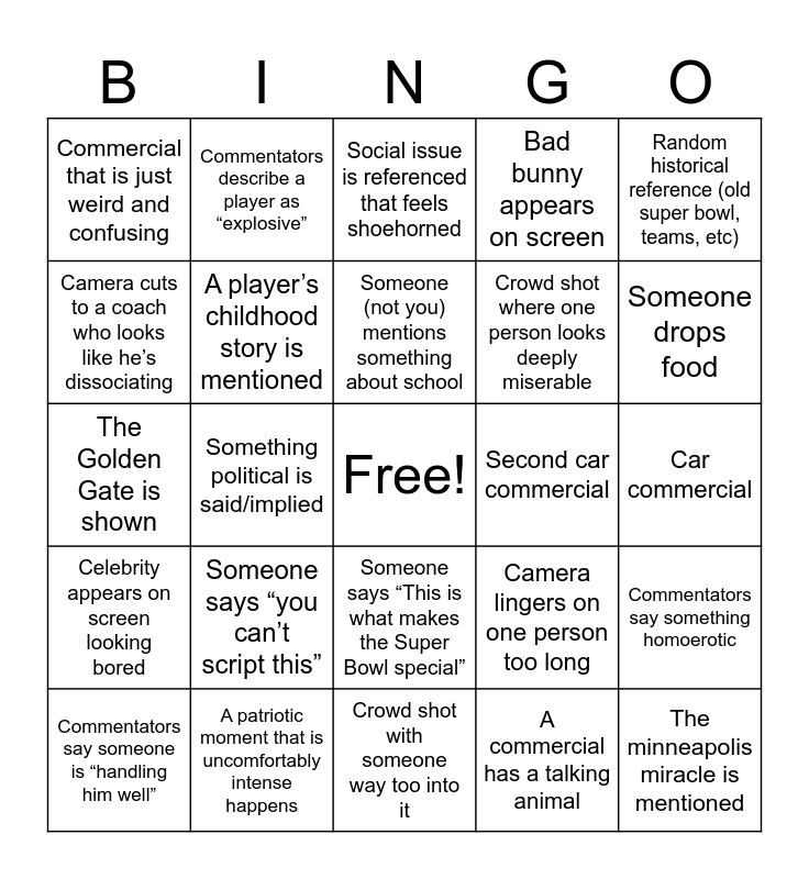 This bingo card has a free space and 41 words: Cardi B appears on stage, The Golden Gate is shown, Commentators overexplain something obvious, A player’s childhood story is mentioned, A patriotic moment that is uncomfortably intense happens, Someone says “This is what makes the Super Bowl special”, Someone (not you) mentions something about school, Skyline shot that has nothing to do with the teams, Random historical reference (old super bowl, teams, etc), Celebrity appears on screen looking bored, Something political is said/implied, Bad bunny appears on screen, The minneapolis miracle is mentioned, Car commercial, Second car commercial, Someone says “you can’t script this”, Bad bunny is wearing a hat, Commercial that is just weird and confusing, Military flyover, Social issue is referenced that feels shoehorned, Commentators say something homoerotic, Commentators say “tight end”, Crowd shot with someone way too into it, Crowd shot where one person looks deeply miserable, A fan is dressed like something that is not related to football, A commercial tries to be emotional and fails, A commercial has a talking animal, A brand tries to be “relatable” to the youth, Someone drops food, Someone eats like a gremlin, Someone starts scrolling instead of watching, Commentators describe a player as “explosive”, Commentators say someone is “handling him well”, Commentators say “he really knows how to finish”, Camera lingers on one person too long, Camera cuts to a coach who looks like he’s dissociating, “Touchdown”, “Field Goal”, “First down”, “Fumble” and “Big Play”.