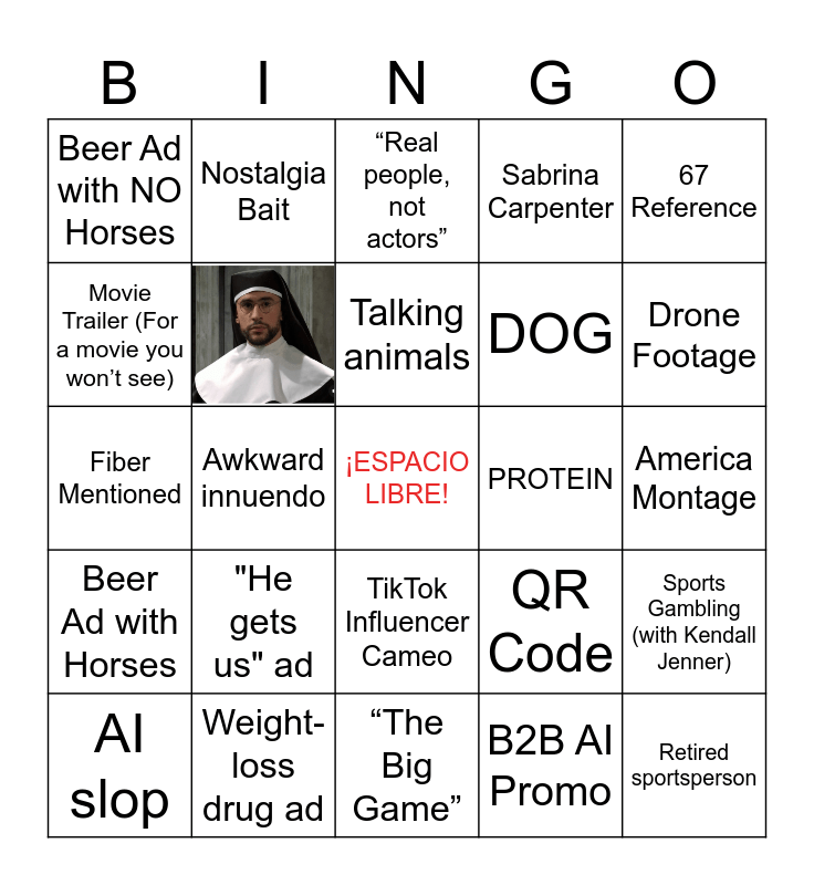 This bingo card has 2 images, a free space and 24 words: TikTok Influencer Cameo, B2B AI Promo, Talking animals, Weight-loss drug ad, 67 Reference, Beer Ad with NO Horses, Movie Trailer (For a movie you won’t see), Nostalgia Bait, America Montage, QR Code, DOG, Fiber Mentioned, Sports Gambling (with Kendall Jenner), AI slop, Awkward innuendo, Talking Candy, Sabrina Carpenter, Beer Ad with Horses, “Real people, not actors”, Retired sportsperson, Drone Footage, “The Big Game”, PROTEIN and "He gets us" ad.
