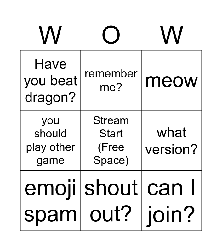This bingo card has a free space and 12 words: What game is this?, do u have spear, can I join?, what version?, remember me?, meow, shout out?, Are you ai?, Have you beat dragon?, you should play other game, emoji spam and what are you doing?.