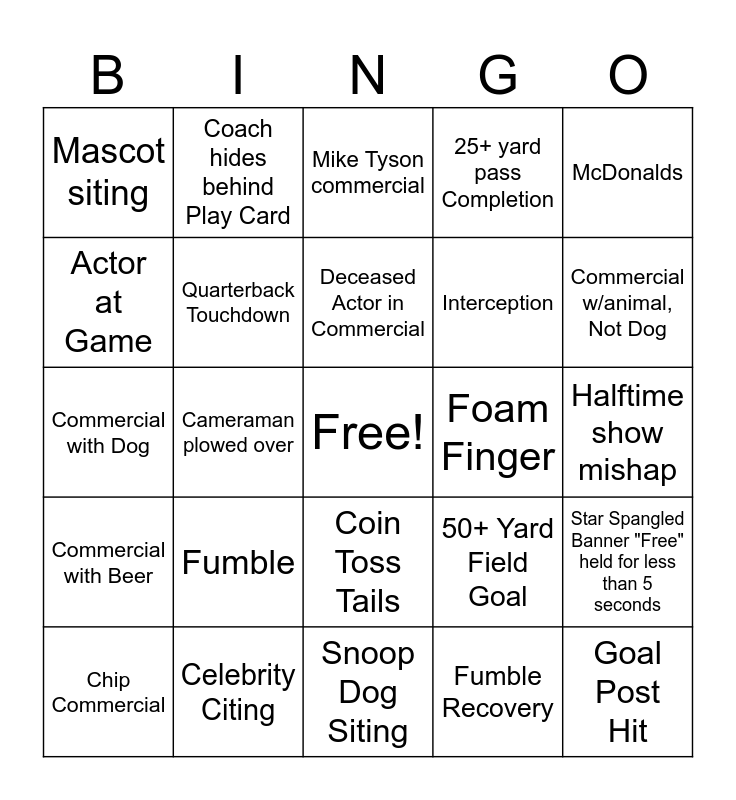 This bingo card has a free space and 24 words: Fumble, Celebrity Citing, Deceased Actor in Commercial, Chip Commercial, McDonalds, Mascot siting, Actor at Game, Coach hides behind Play Card, Foam Finger, Coin Toss Tails, Interception, Commercial with Dog, 50+ Yard Field Goal, Star Spangled Banner "Free" held for less than 5 seconds, Quarterback Touchdown, Fumble Recovery, Halftime show mishap, Mike Tyson commercial, Commercial w/animal, Not Dog, Cameraman plowed over, Goal Post Hit, Commercial with Beer, 25+ yard pass Completion and Snoop Dog Siting.