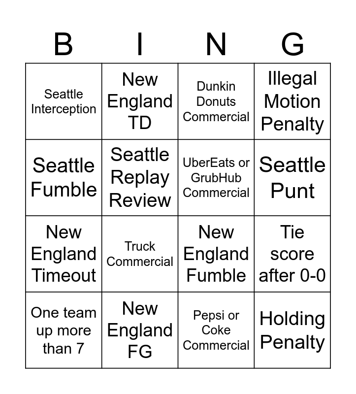 This bingo card has 24 words: Seattle TD, Seattle FG, Seattle Punt, Seattle Timeout, Seattle Fumble, Seattle Interception, Seattle Replay Review, New England TD, New England FG, New England punt, New England Timeout, New England Fumble, New England Interception, New England Replay Review, UberEats or GrubHub Commercial, Beer Commercial, Pepsi or Coke Commercial, Dunkin Donuts Commercial, Truck Commercial, Tie score after 0-0, One team up more than 7, Holding Penalty, Illegal Motion Penalty and Off Sides Penalty.