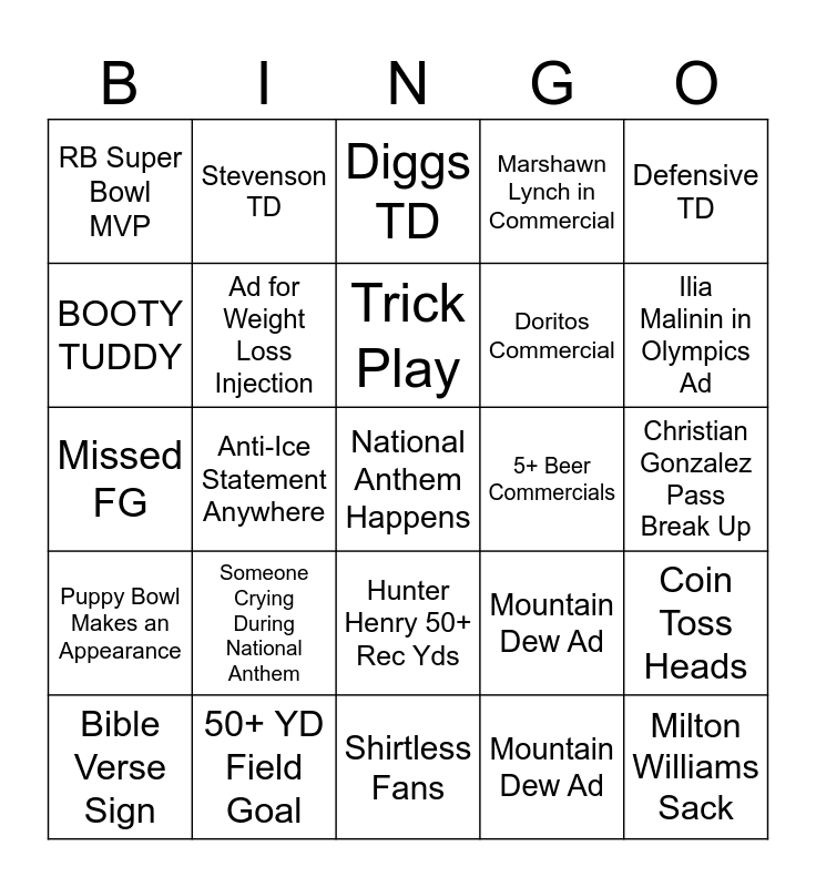 This bingo card has a free space and 49 words: Smith Njigba TD, Milton Williams Sack, Clydesdales On Screen, Shirtless Fans, Someone Crying During National Anthem, Maye Rushing TD, Stevenson TD, 50+ Yd Catch, BOOTY TUDDY, Drake Maye 225 Yds, Ad for Weight Loss Injection, Marshawn Lynch in Commercial, Coin Toss Heads, Mountain Dew Ad, Walker 20+ Yd Run, Darnold 2 Passing TDs, Trick Play, 5+ Beer Commercials, Russell Wilson's Unlimited INT Shown, Defensive TD, Anti-Ice Statement Anywhere, Mountain Dew Ad, RB Super Bowl MVP, Doritos Commercial, Smith Njigba 100+ Rec Yds, Ilia Malinin in Olympics Ad, Bible Verse Sign, Fumble Recovered by D, Hunter Henry 50+ Rec Yds, Puppy Bowl Makes an Appearance, Ineligible Player Downfield Penalty, Clayton puts his hands on his head in disbelief, Super Mario Trailer, Cooper Kupp 5+ Catches, 50+ YD Field Goal, Anytime Snoop Dogg, Jesus Commercial, Cris Collinsworth Glazes Patrick Mahomes, Christian Gonzalez Pass Break Up, Roughing the Passer Penalty, Cardi B at Halftime Show, Leonard Williams Sack, Walker TD, Jake Bobo 2+ Catches, Missed FG, Diggs TD, Interception, Rasheed Shaheed TD and Coin Toss Tails.