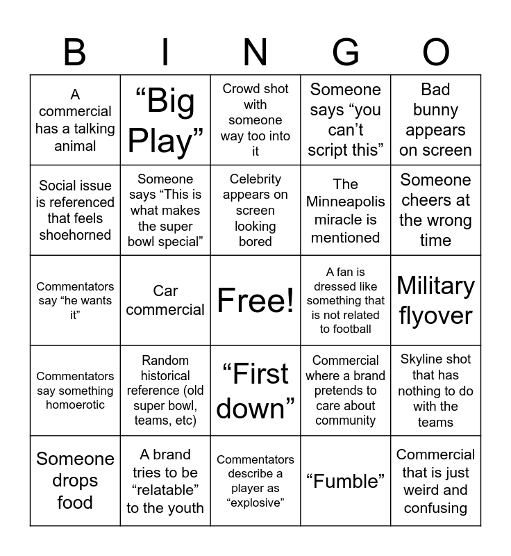 This bingo card has a free space and 38 words: The golden gate is shown, A player’s childhood story is mentioned, A patriotic moment that is uncomfortably intense happens, Someone says “This is what makes the super bowl special”, Skyline shot that has nothing to do with the teams, Random historical reference (old super bowl, teams, etc), Celebrity appears on screen looking bored, Something political is said/implied, Bad bunny appears on screen, The Minneapolis miracle is mentioned, Car commercial, Someone says “you can’t script this”, Commercial that is just weird and confusing, Military flyover, Social issue is referenced that feels shoehorned, Commentators say something homoerotic, Commentators say “tight end”, Crowd shot with someone way too into it, Crowd shot where one person looks deeply miserable, A fan is dressed like something that is not related to football, A commercial has a talking animal, A brand tries to be “relatable” to the youth, Someone cheers at the wrong time, Someone drops food, Someone starts scrolling instead of watching, Commentators describe a player as “explosive”, Commentators say someone is “handling him well”, Commentators say “he really knows how to finish”, Camera cuts to a coach who looks like he’s dissociating, “Touchdown”, “Field Goal”, “First down”, “Fumble”, “Big Play”, “Plenty of time left”, Commercial where a brand pretends to care about community, Commentators say “he wants it” and Commercial with a doorbell/smart home device.