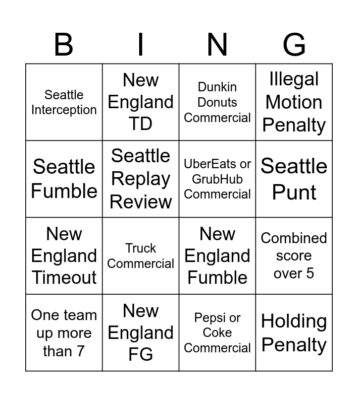 This bingo card has 24 words: Seattle TD, Seattle FG, Seattle Punt, Seattle Timeout, Seattle Fumble, Seattle Interception, Seattle Replay Review, New England TD, New England FG, New England punt, New England Timeout, New England Fumble, New England Interception, New England Replay Review, UberEats or GrubHub Commercial, Beer Commercial, Pepsi or Coke Commercial, Dunkin Donuts Commercial, Truck Commercial, Combined score over 5, One team up more than 7, Holding Penalty, Illegal Motion Penalty and Off Sides Penalty.
