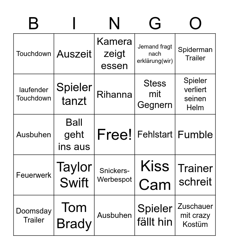 This bingo card has a free space and 24 words: Taylor Swift, Tom Brady, Rihanna, Doomsday Trailer, Spiderman Trailer, Touchdown, laufender Touchdown, Auszeit, Fehlstart, Snickers-Werbespot, Stess mit Gegnern, Ausbuhen, Kiss Cam, Trainer schreit, Spieler tanzt, Spieler fällt hin, Fumble, Kamera zeigt essen, Spieler verliert seinen Helm, Ball geht ins aus, Zuschauer mit crazy Kostüm, Feuerwerk, Jemand fragt nach erklärung(wir) and Ausbuhen.