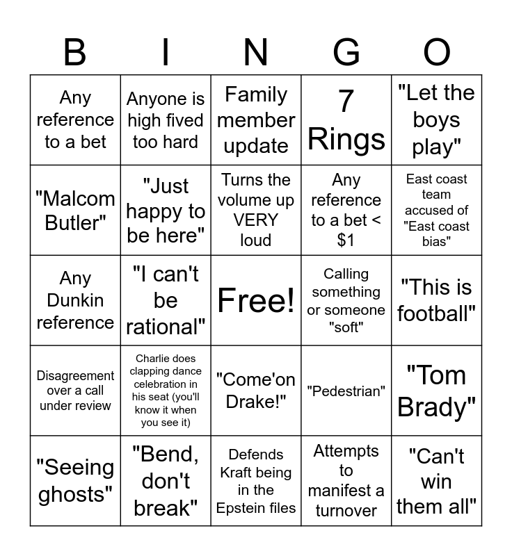 This bingo card has a free space and 30 words: "Bend, don't break", "Game of inches", "I can't be rational", Says they are ok with injury to a player on the other team, Any reference to a bet, Family member update, "Just happy to be here", "Come'on Drake!", Calling something or someone "soft", Defends Kraft being in the Epstein files, "This is football", "Can't win them all", Attempts to manifest a turnover, West coast team accused of "East coast bias", East coast team accused of "East coast bias", Flag throwing motion, "Pedestrian", Disagreement over a call under review, Charlie does clapping dance celebration in his seat (you'll know it when you see it), "Let the boys play", Any Dunkin reference, Paul locks anyone out on the front porch, Anyone is high fived too hard, Any reference to a bet < $1, "Malcom Butler", 7 Rings, "Tom Brady", "Seeing ghosts", Turns the volume up VERY loud and Any light color change.