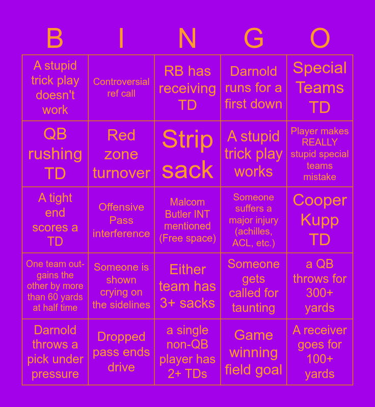 This bingo card has a free space and 52 words: Game goes into OT, A receiver goes for 100+ yards, a rusher goes for 100+ yards, a single non-QB player has 2+ TDs, Someone is shown crying on the sidelines, Missed or blocked field goal/extra point, Controversial ref call, Penalty negates a TD or big gain, QB rushing TD, Tipped pass leads to interception, Red zone turnover, Opening drive TD, a QB throws for 300+ yards, Someone gets called for taunting, 50+ yard field goal gets made, 30+ yard TD, Strip sack, Someone suffers a major injury (achilles, ACL, etc.), Game Winning TD, Special Teams TD, Offensive Pass interference, Game winning field goal, A stupid trick play doesn't work, A stupid trick play works, 3rd/4th an 15+ gets converted, Both teams combine for multiple interceptions, Fumble lost, Backup player scores a TD, Player makes REALLY stupid special teams mistake, Kayshon Boutte TD, Stefon Diggs' criminal situation gets mentioned, Darnold runs for a first down, Someone gets hurdled or juked, Unnecessary Roughness Penalty, Drake Maye gets compared to Brady, RB has receiving TD, Dropped pass ends drive, Safety, One handed catch, A non QB wins SBMVP, Close review on a catch/turnover, Cooper Kupp TD, One team out-gains the other by more than 60 yards at half time, Both teams combine for 40+ points, Either team has 3+ sacks, Successful Tush Push, Notable athlete of a different sport is seen, A tight end scores a TD, Seahawks attempt a pass within the 5 yard line, Cris Collinsworth mentions Mahomes, Darnold throws a pick under pressure and Milton Williams gets a sack.