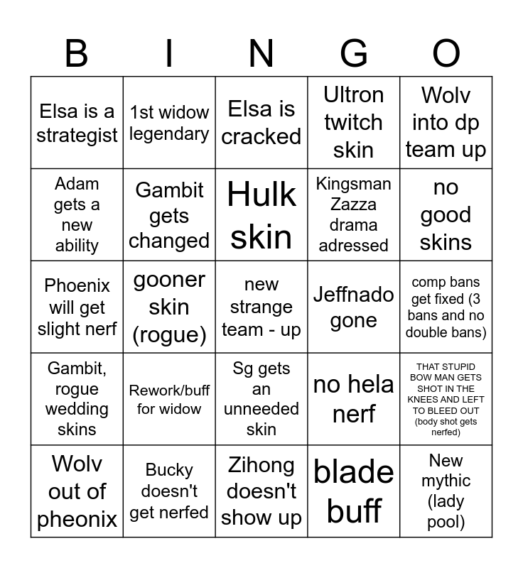 This bingo card has a free space and 24 words: Rework/buff for widow, Bucky doesn't get nerfed, Hulk skin, Wolv out of pheonix, Wolv into dp team up, Elsa is a strategist, Adam gets a new ability, 1st widow legendary, Jeffnado gone, Sg gets an unneeded skin, Kingsman Zazza drama adressed, Phoenix will get slight nerf, no hela nerf, THAT STUPID BOW MAN GETS SHOT IN THE KNEES AND LEFT TO BLEED OUT (body shot gets nerfed), Gambit gets changed, blade buff, comp bans get fixed (3 bans and no double bans), Elsa is cracked, no good skins, gooner skin (rogue), New mythic (lady pool), Gambit, rogue wedding skins, Ultron twitch skin and Zihong doesn't show up.