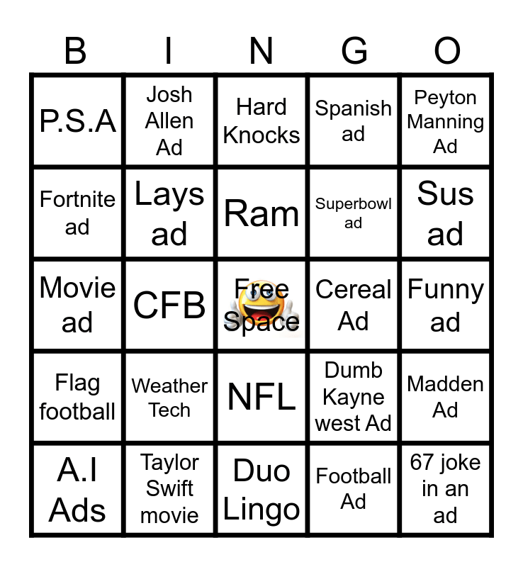 This bingo card has a free space and 24 words: A.I Ads, Weather Tech, Ram, Football Ad, Peyton Manning Ad, P.S.A, Josh Allen Ad, Hard Knocks, Cereal Ad, Funny ad, Movie ad, Lays ad, Dumb Kayne west Ad, Madden Ad, Fortnite ad, Taylor Swift movie, Duo Lingo, Spanish ad, Sus ad, Flag football, CFB, NFL, Superbowl ad and 67 joke in an ad.