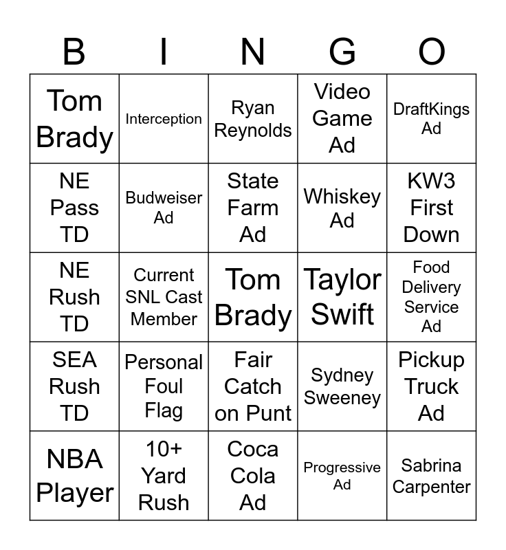 This bingo card has a free space and 55 words: Snoop Dogg, NBA Player, MLB Player, Tom Brady, Coca Cola Ad, Pepsi Ad, Budweiser Ad, Doritos Ad, Whiskey Ad, Vodka Ad, Video Game Ad, Animated Movie Ad, Talking Animal, Costumed Mascot (i.e. Gritty), TikTok Dance, FanDuel Ad, DraftKings Ad, Current SNL Cast Member, Former SNL Cast Member, Sabrina Carpenter, Taylor Swift, Bad Bunny, Sydney Sweeney, Ryan Reynolds, Chris Pratt, State Farm Ad, Progressive Ad, Pizza Ad, Food Delivery Service Ad, Pickup Truck Ad, Shirtless Fan, Fan chugs beer, Someone says “let’s go”, Fans high five, NE Pass TD, NE Rush TD, SEA Pass TD, SEA Rush TD, SEA Field Goal, NE Field Goal, Interception, Fumble Lost, Holding Flag, False Start Flag, Personal Foul Flag, 10+ Yard Rush, 20+ Yard Reception, Sack by NE, Sack by SEA, KW3 First Down, JSN First Down, Diggs First Down, Stevenson First Down, Fair Catch on Punt and Touchback on Kickoff.