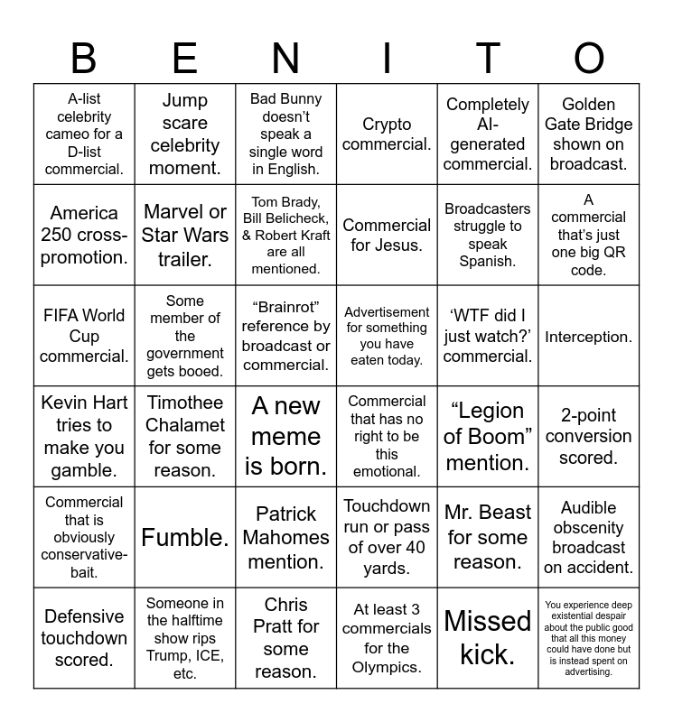 This bingo card has 36 words: Touchdown run or pass of over 40 yards., Patrick Mahomes mention., At least 3 commercials for the Olympics., America 250 cross- promotion., Kevin Hart tries to make you gamble., Advertisement for something you have eaten today., Marvel or Star Wars trailer., Chris Pratt for some reason., Completely AI-generated commercial., Mr. Beast for some reason., A commercial that’s just one big QR code., Crypto commercial., Audible obscenity broadcast on accident., Some member of the government gets booed., Commercial for Jesus., A-list celebrity cameo for a D-list commercial., Commercial that is obviously conservative- bait., ‘WTF did I just watch?’ commercial., FIFA World Cup commercial., Bad Bunny doesn’t speak a single word in English., “Brainrot” reference by broadcast or commercial., Timothee Chalamet for some reason., Commercial that has no right to be this emotional., A new meme is born., “Legion of Boom” mention., Jump scare celebrity moment., Broadcasters struggle to speak Spanish., Someone in the halftime show rips Trump, ICE, etc., Tom Brady, Bill Belicheck, & Robert Kraft are all mentioned., Golden Gate Bridge shown on broadcast., You experience deep existential despair about the public good that all this money could have done but is instead spent on advertising., Defensive touchdown scored., 2-point conversion scored., Interception., Fumble. and Missed kick..