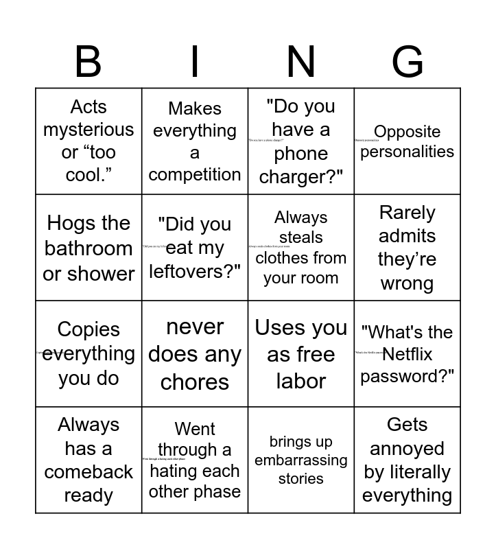 This bingo card has 7 images and 16 words: Went through a hating each other phase, "What's the Netflix password?", "Do you have a phone charger?", Acts mysterious or “too cool.”, Copies everything you do, Makes everything a competition, Uses you as free labor, brings up embarrassing stories, Hogs the bathroom or shower, "Did you eat my leftovers?", Always has a comeback ready, Opposite personalities, never does any chores, Rarely admits they’re wrong, Always steals clothes from your room and Gets annoyed by literally everything.