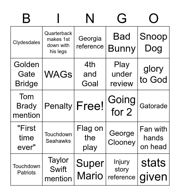 This bingo card has a free space and 24 words: Touchdown Seahawks, Taylor Swift mention, 4th and Goal, Touchdown Patriots, Snoop Dog, Clydesdales, Golden Gate Bridge, Quarterback makes 1st down with his legs, Going for 2, Flag on the play, Play under review, Tom Brady mention, George Clooney, Fan with hands on head, WAGs, Injury story reference, Gatorade, Georgia reference, glory to God, Penalty, stats given, "First time ever", Bad Bunny and Super Mario.