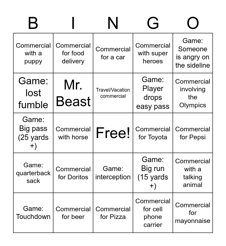 This bingo card has a free space and 29 words: Game: Touchdown, Game: Field goal, Commercial with horse, Commercial with baby, Commercial with a puppy, Commercial for a car, Mr. Beast, Commercial for Doritos, Commercial for Toyota, Commercial for beer, Commercial for Pepsi, Commercial for mayonnaise, Commercial for Pizza, Commercial for cell phone carrier, Commercial involving the Olympics, Game: Time out is called, Game: interception, Game: quarterback sack, Game: Someone is angry on the sideline, Game: Big pass (25 yards +), Game: Big run (15 yards +), Game: Someone argues with a referee, Game: Player drops easy pass, Game: lost fumble, Commercial with super heroes, Commercial for food delivery, Commercial with a talking animal, Travel/Vacation commercial and Fans boo.