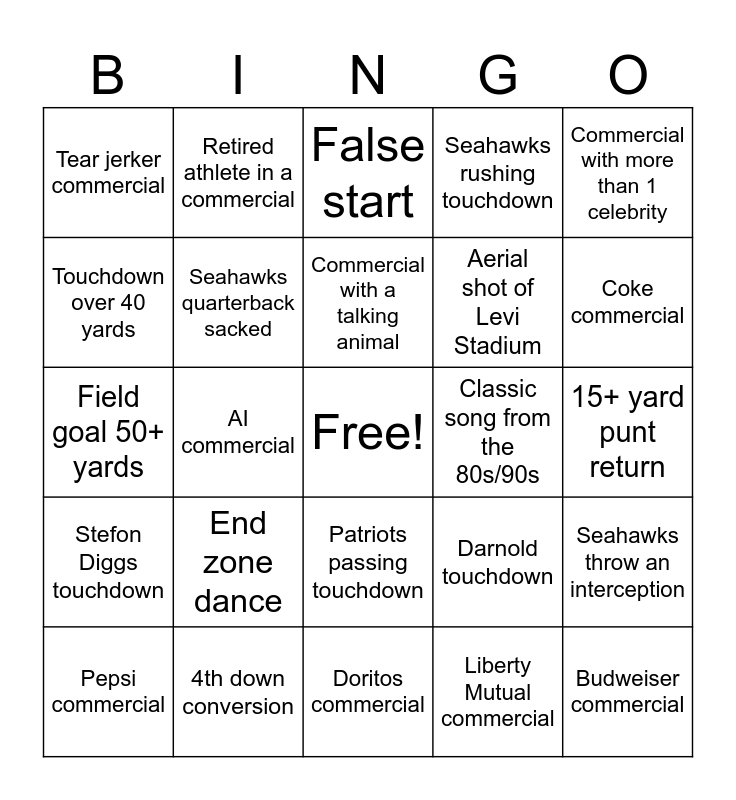 This bingo card has a free space and 47 words: Kenneth Walker III touchdown, Budweiser commercial, Celebrity sighting, Doritos commercial, End zone dance, QR code shown during commercial, Retired athlete in a commercial, State Farm commercial, Touchdown over 40 yards, Seahawks passing touchdown, Seahawks quarterback sacked, Seahawks rushing touchdown, Seahawks throw an interception, Darnold touchdown, JSN Touchdown, Maye touchdown, Commercial with a talking animal, Classic song from the 80s/90s, Movie trailer, Commercial with more than 1 celebrity, AI commercial, Liberty Mutual commercial, Tear jerker commercial, Aerial shot of Levi Stadium, Player go into medical tent, Coke commercial, Pepsi commercial, Uber Eats commercial, Patriots passing touchdown, Stefon Diggs touchdown, TreVeyon Henderson touchdown, Patriots Quarterback sacked, Patriots rushing touchdown, Patriots throw interception, 2 point conversion, 4th down conversion, 15+ yard punt return, 20+ yard rush, Any team scores 20+ points, Challenge flag thrown, Delay of game called, False start, Field goal 50+ yards, Fumble recovery by defense, Missed field goal, Pass interference called and Roughing the passer.