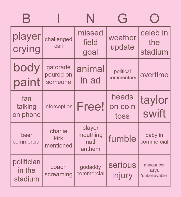 This bingo card has a free space and 24 words: charlie kirk mentioned, coach screaming, animal in ad, politician in the stadium, celeb in the stadium, player crying, body paint, challenged call, heads on coin toss, player mouthing natl anthem, political commentary, fan talking on phone, fumble, baby in commercial, gatorade poured on someone, serious injury, taylor swift, missed field goal, overtime, interception, announcer says "unbelievable", beer commercial, weather update and godaddy commercial.