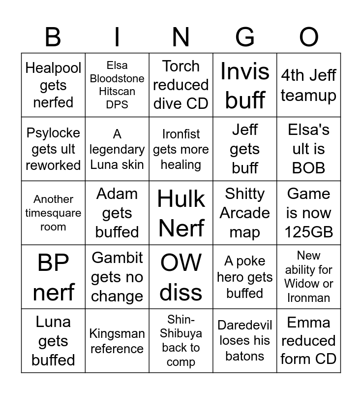 This bingo card has 25 words: Gambit gets no change, Shin-Shibuya back to comp, Ironfist gets more healing, Luna gets buffed, 4th Jeff teamup, Healpool gets nerfed, Psylocke gets ult reworked, Elsa Bloodstone Hitscan DPS, Shitty Arcade map, OW diss, Jeff gets buff, Another timesquare room, A poke hero gets buffed, New ability for Widow or Ironman, A legendary Luna skin, Emma reduced form CD, Game is now 125GB, Torch reduced dive CD, Elsa's ult is BOB, Adam gets buffed, Hulk Nerf, Kingsman reference, BP nerf, Invis buff and Daredevil loses his batons.
