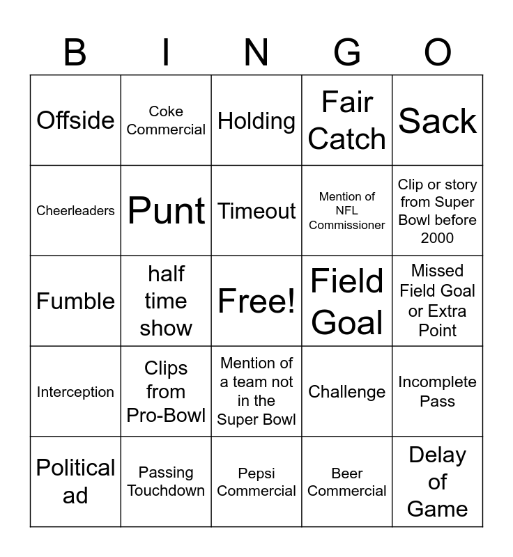 This bingo card has a free space and 27 words: Rushing Touchdown, Passing Touchdown, Timeout, Beer Commercial, Sack, Cheerleaders, Coke Commercial, Pepsi Commercial, Field Goal, Incomplete Pass, Interception, Punt, Challenge, Delay of Game, Fumble, Extra Point, Holding, Fair Catch, Missed Field Goal or Extra Point, Offside, Clips from Pro-Bowl, Mention of a team not in the Super Bowl, Mention of NFL Commissioner, Clip or story from Super Bowl before 2000, Political ad, half time show and ai ad.