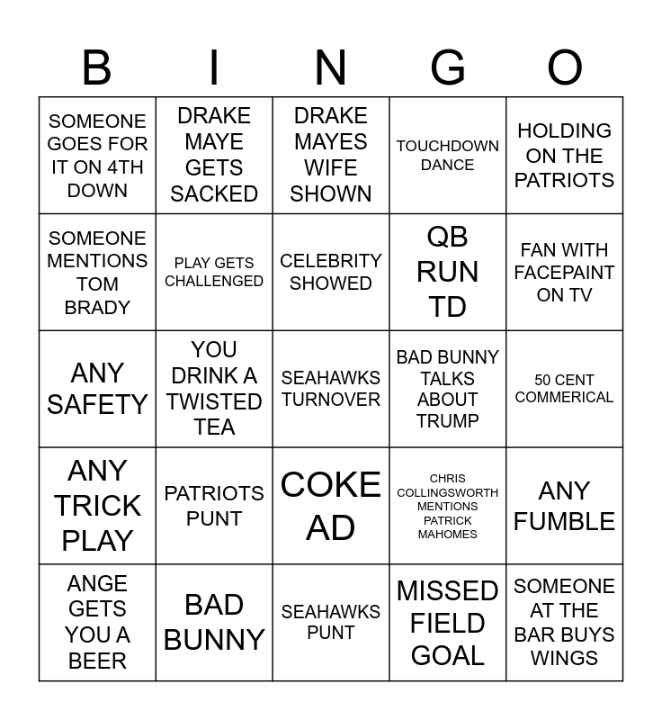 This bingo card has 50 words: YOU TAKE A SHOT OF MALORT/FERNET, SEAHAWKS TURNOVER, PARTIOTS TURNOVER, SEAHAWKS PUNT, PATRIOTS PUNT, ANY FIELD GOAL, DRAKE MAYE GETS SACKED, SAM DARNOLD GETS SACKED, SOMEONE MENTIONS TOM BRADY, BEER COMMERICAL, PLAY GETS CHALLENGED, TOUCHDOWN DANCE, ANY FUMBLE, CHRIS COLLINGSWORTH MENTIONS PATRICK MAHOMES, TRUCK COMMERICAL, BAD BUNNY GETS POLITICAL, CELEBRITY SHOWED, BAD BUNNY TALKS ABOUT TRUMP, HOLDING ON THE SEASHAWKS, HOLDING ON THE PATRIOTS, YOU DRINK A TWISTED TEA, MISSED FIELD GOAL, SOMEONE GOES FOR IT ON 4TH DOWN, QB RUN TD, PASS INTERFERENCE CALL, SOMEONE AT THE BAR BUYS WINGS, FAN WITH FACEPAINT ON TV, DRAKE MAYE HIGHLIGHT REAL, DRAKE MAYES WIFE SHOWN, COKE AD, JAXON SMITH NJIGBA TD, DIGGS TD, 20+ YARD RUN, YOU LEAVE US A REVIEW ON GOOGLE, BAD BUNNY, PLAYER INJURY, YOU TRY A NEW BEER, ANNOUNCERS SAY "TUSH PUSH", BAR DOES AN EAGLES CHANT, 50 CENT COMMERICAL, REFS HUDDLE, GATORADE BATH ON COACH, GREEN DAY GETS POLITICAL, TIM HEADBANGS WITH HIS HAIR DOWN, ANGE GETS YOU A BEER, ANY SAFETY, YOU TAKE A SHOT, PEPSI AD, ANY TRICK PLAY and YOU FOLLOW MAKERS ON INSTAGRAM.