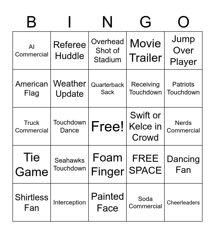 This bingo card has a free space and 25 words: Seahawks Touchdown, Painted Face, Quarterback Sack, Shirtless Fan, Jump Over Player, AI Commercial, American Flag, Referee Huddle, Swift or Kelce in Crowd, Foam Finger, Receiving Touchdown, Truck Commercial, FREE SPACE, Dancing Fan, Weather Update, Fumble, Nerds Commercial, Overhead Shot of Stadium, Patriots Touchdown, Touchdown Dance, Cheerleaders, Interception, Tie Game, Movie Trailer and Soda Commercial.