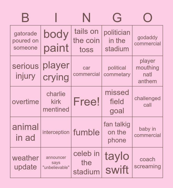 This bingo card has a free space and 24 words: interception, announcer says "unbelievable", car commercial, weather update, godaddy commercial, gatorade poured on someone, serious injury, body paint, missed field goal, fumble, political commetary, overtime, fan talkig on the phone, baby in commercial, player crying, taylo swift, challenged call, tails on the coin toss, player mouthing natl anthem, charlie kirk mentined, coach screaming, animal in ad, politician in the stadium and celeb in the stadium.