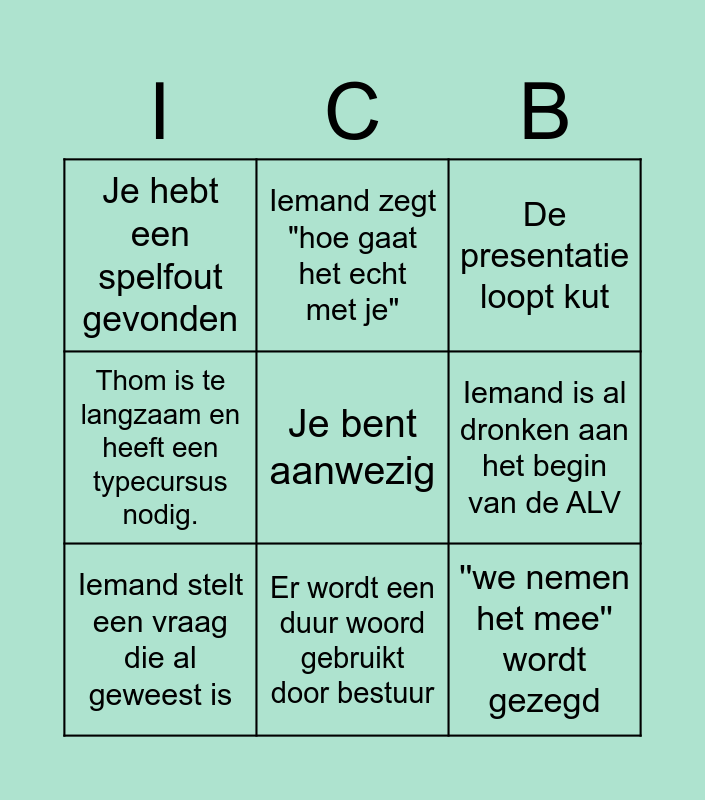 This bingo card has a free space and 18 words: Je stelt een vraag, Je stelt een goede vraag, De presentatie loopt kut, Je hebt een spelfout gevonden, Omwille van de tijd o.i.d. wordt gezegd, Thom is te langzaam en heeft een typecursus nodig., Iemand komt te laat, Iemand zegt "hoe gaat het echt met je", Er wordt een duur woord gebruikt door bestuur, Een sticker waardige foto wordt gemaakt, Iemand wilt een vraag stellen maar weet hem niet meer, ''we nemen het mee'' wordt gezegd, Er wordt iets gegooid, Iemand is al dronken aan het begin van de ALV, Iemand stelt een vraag die al geweest is, De alv duurt langer dan 1,5 uur, Er zijn 3 sjaars aanwezig and De voorzitter zoekt naar woorden.