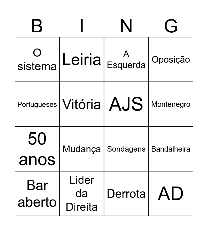 This bingo card has 16 words: Lider da Direita, Bandalheira, A Esquerda, O sistema, 50 anos, Leiria, Sondagens, Derrota, Portugueses, Vitória, Bar aberto, Oposição, Mudança, Montenegro, AJS and AD.