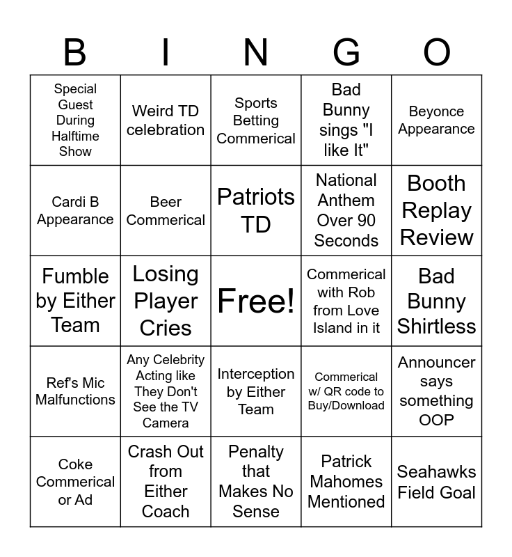 This bingo card has a free space and 24 words: Any Celebrity Acting like They Don't See the TV Camera, Crash Out from Either Coach, Patriots TD, Coke Commerical or Ad, Beyonce Appearance, Special Guest During Halftime Show, Cardi B Appearance, Weird TD celebration, Commerical with Rob from Love Island in it, Interception by Either Team, National Anthem Over 90 Seconds, Fumble by Either Team, Commerical w/ QR code to Buy/Download, Announcer says something OOP, Beer Commerical, Patrick Mahomes Mentioned, Bad Bunny Shirtless, Sports Betting Commerical, Booth Replay Review, Losing Player Cries, Seahawks Field Goal, Ref's Mic Malfunctions, Bad Bunny sings "I like It" and Penalty that Makes No Sense.