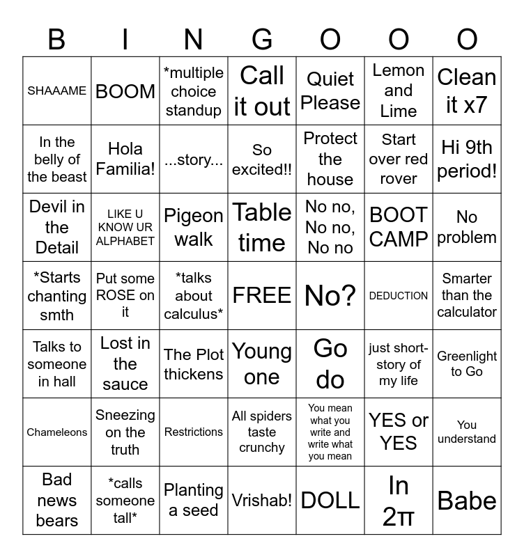This bingo card has a free space and 48 words: You mean what you write and write what you mean, Start over red rover, Vrishab!, Put some ROSE on it, Pigeon walk, Smarter than the calculator, BOOM, *calls someone tall*, Lemon and Lime, Young one, Clean it x7, Call it out, BOOT CAMP, No no, No no, No no, Chameleons, DEDUCTION, In the belly of the beast, Hi 9th period!, YES or YES, Quiet Please, Protect the house, *talks about calculus*, SHAAAME, Hola Familia!, You understand, ...story..., No problem, Bad news bears, Table time, LIKE U KNOW UR ALPHABET, In 2π, No?, Greenlight to Go, Sneezing on the truth, *Starts chanting smth, Go do, just short- story of my life, Devil in the Detail, The Plot thickens, Restrictions, Talks to someone in hall, Babe, *multiple choice standup, Planting a seed, So excited!!, All spiders taste crunchy, Lost in the sauce and DOLL.