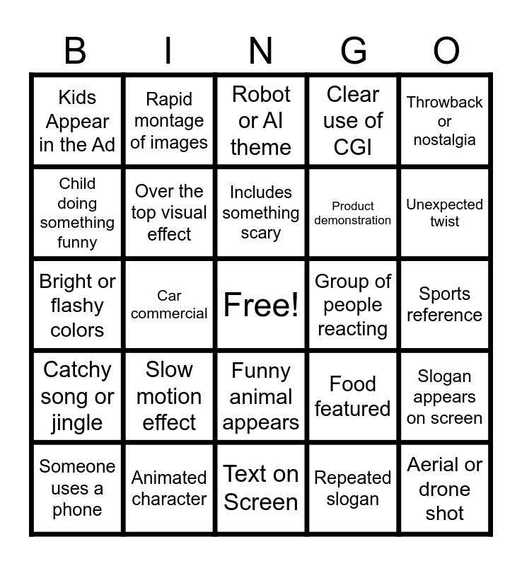 This bingo card has a free space and 29 words: Someone uses a phone, Features a costume or mascot, Car commercial, Movie or TV reference, Kids Appear in the Ad, Robot or AI theme, Over the top visual effect, Slow motion effect, Group of people reacting, Animated character, Sports reference, Aerial or drone shot, Text on Screen, Repeated slogan, Unexpected twist, Celebrity cameo, Funny animal appears, Catchy song or jingle, Throwback or nostalgia, Bright or flashy colors, Food featured, Silly or exaggerated humor, Product demonstration, Child doing something funny, Clear use of CGI, Rapid montage of images, Slogan appears on screen, Includes something scary and Multiple camera angles shown.