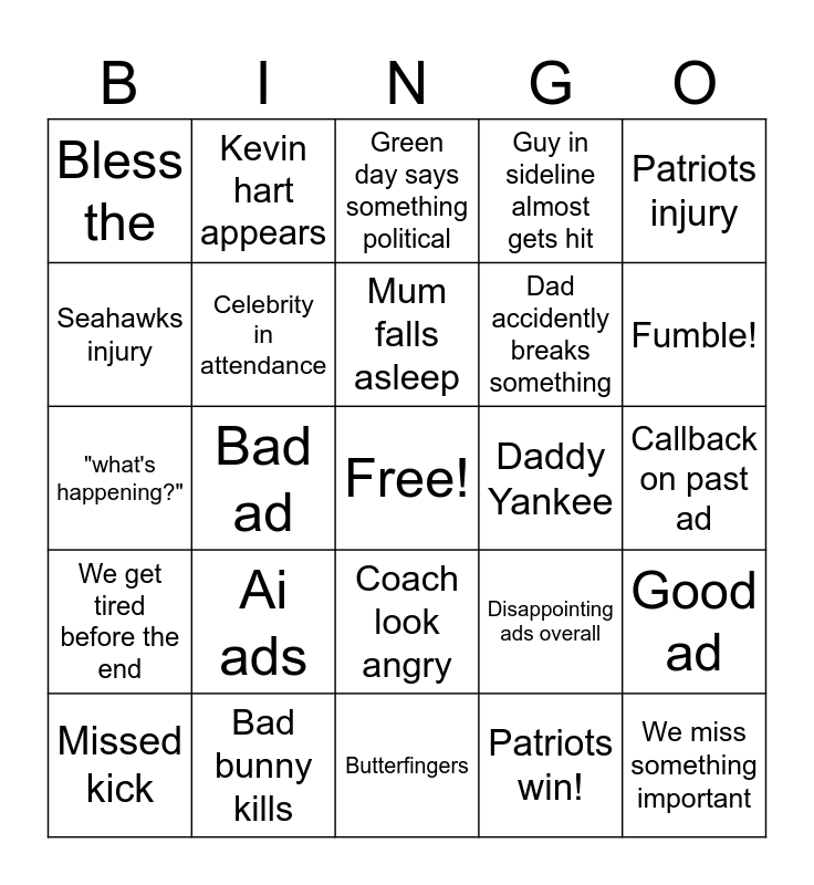 This bingo card has a free space and 24 words: Ai ads, Bad bunny kills, Mum falls asleep, Missed kick, Patriots injury, Bless the, Seahawks injury, Kevin hart appears, Daddy Yankee, Coach look angry, Dad accidently breaks something, "what's happening?", Disappointing ads overall, Good ad, Celebrity in attendance, Patriots win!, Callback on past ad, Green day says something political, Fumble!, Bad ad, We miss something important, We get tired before the end, Guy in sideline almost gets hit and Butterfingers.