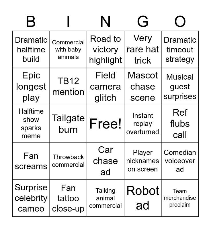 This bingo card has a free space and 24 words: Throwback commercial, Fan tattoo close-up, Field camera glitch, Surprise celebrity cameo, Dramatic timeout strategy, Dramatic halftime build, Epic longest play, Commercial with baby animals, Instant replay overturned, Car chase ad, Mascot chase scene, Halftime show sparks meme, Player nicknames on screen, Comedian voiceover ad, TB12 mention, Robot ad, Ref flubs call, Road to victory highlight, Musical guest surprises, Tailgate burn, Team merchandise proclaim, Fan screams, Very rare hat trick and Talking animal commercial.