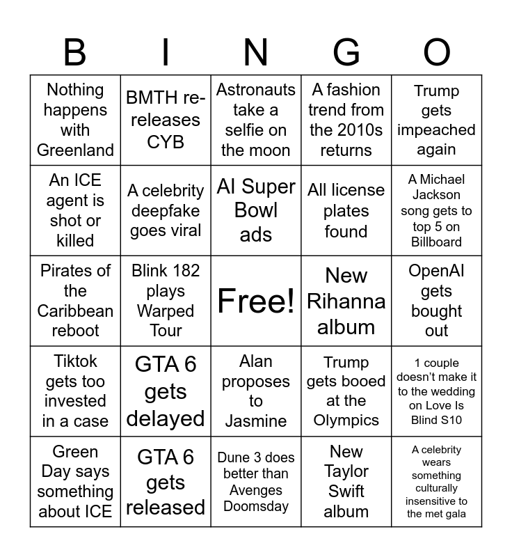 This bingo card has a free space and 24 words: GTA 6 gets delayed, GTA 6 gets released, AI Super Bowl ads, Green Day says something about ICE, Trump gets impeached again, Nothing happens with Greenland, An ICE agent is shot or killed, BMTH re-releases CYB, New Rihanna album, Alan proposes to Jasmine, All license plates found, Pirates of the Caribbean reboot, Trump gets booed at the Olympics, 1 couple doesn’t make it to the wedding on Love Is Blind S10, A celebrity deepfake goes viral, New Taylor Swift album, OpenAI gets bought out, Astronauts take a selfie on the moon, A Michael Jackson song gets to top 5 on Billboard, Blink 182 plays Warped Tour, A celebrity wears something culturally insensitive to the met gala, Tiktok gets too invested in a case, A fashion trend from the 2010s returns and Dune 3 does better than Avenges Doomsday.