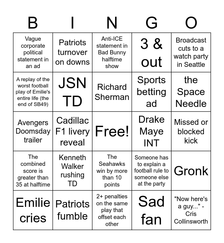 This bingo card has a free space and 29 words: Emilie cries, The Odyssey trailer, Cadillac F1 livery reveal, Someone spills a drink, Vague corporate political statement in an ad, Anti-ICE statement in Bad Bunny halftime show, JSN TD, Kenneth Walker rushing TD, Drake Maye INT, Patriots fumble, Missed or blocked kick, "Now here's a guy..." - Cris Collinsworth, 2+ penalties on the same play that offset each other, Sad fan, the Space Needle, A fan dressed as someone from circa 1776, The Seahawks win by more than 10 points, The combined score is greater than 35 at halftime, Broadcast cuts to a watch party in Seattle, Avengers Doomsday trailer, Someone has to explain a football rule to someone else at the party, Injury timeout, Sports betting ad, A replay of the worst football play of Emilie's entire life (the end of SB49), 3 & out, Patriots turnover on downs, Gronk, Richard Sherman and A player gets a penalty for fighting.