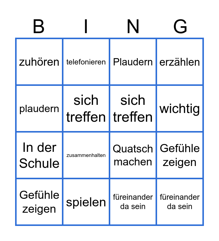 ⚠ This card has duplicate items: füreinander da sein (2), zuhören (2), sich treffen (2), Gefühle zeigen (2), Quatsch machen (2)
