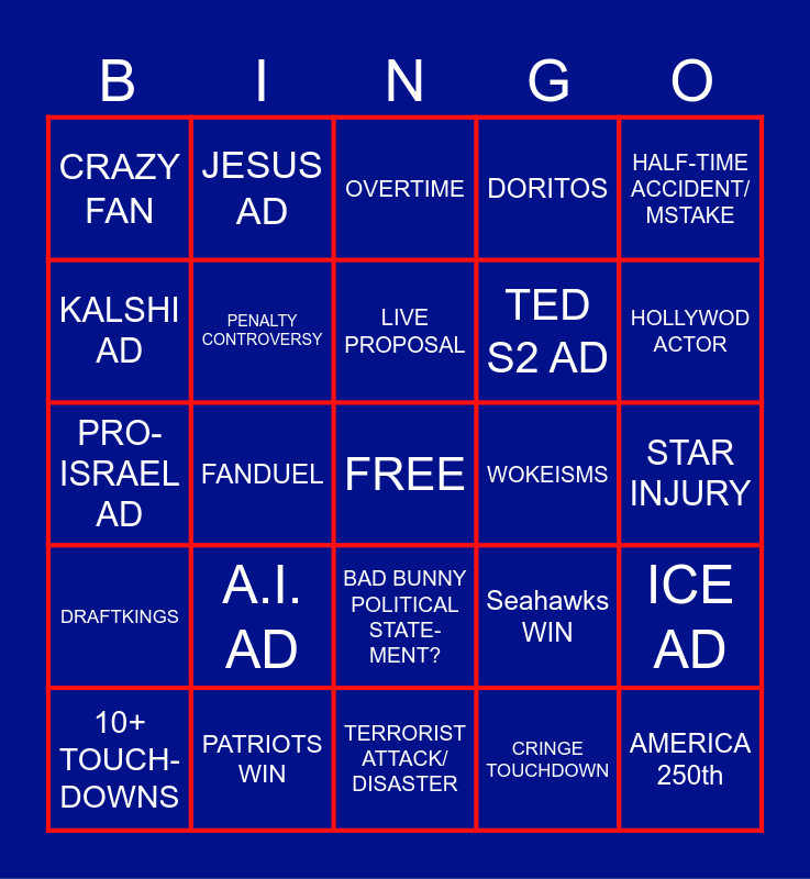 This bingo card has a free space and 24 words: A.I. AD, PATRIOTS WIN, LIVE PROPOSAL, 10+ TOUCH- DOWNS, HALF-TIME ACCIDENT/ MSTAKE, CRAZY FAN, KALSHI AD, JESUS AD, WOKEISMS, BAD BUNNY POLITICAL STATE- MENT?, TED S2 AD, PRO-ISRAEL AD, Seahawks WIN, ICE AD, PENALTY CONTROVERSY, CRINGE TOUCHDOWN, STAR INJURY, OVERTIME, HOLLYWOD ACTOR, FANDUEL, AMERICA 250th, DRAFTKINGS, DORITOS and TERRORIST ATTACK/ DISASTER.