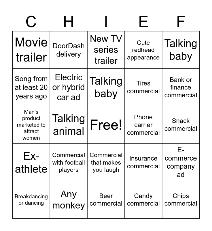 This bingo card has a free space and 31 words: Beer commercial, Fast food commercial, Talking animal, Celebrity voice-over, Movie trailer, New TV series trailer, Electric or hybrid car ad, Insurance commercial, Phone carrier commercial, Candy commercial, Snack commercial, Chips commercial, Soda commercial, Coffee commercial, Bank or finance commercial, Tax service commercial, E-commerce company ad, Commercial with football players, Ex-athlete, Commercial that makes you laugh, Talking baby, Person falling over, Breakdancing or dancing, DoorDash delivery, Tires commercial, Song from at least 20 years ago, Cute redhead appearance, Man’s product marketed to attract women, Any monkey, Talking baby and Free Space.