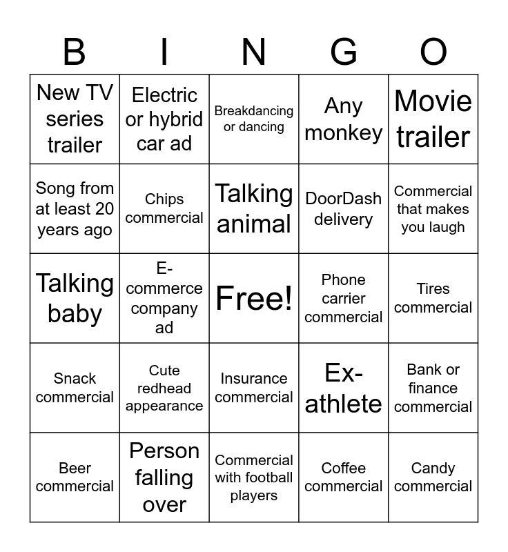This bingo card has a free space and 30 words: Beer commercial, Fast food commercial, Talking animal, Celebrity voice-over, Movie trailer, New TV series trailer, Electric or hybrid car ad, Insurance commercial, Phone carrier commercial, Candy commercial, Snack commercial, Chips commercial, Soda commercial, Coffee commercial, Bank or finance commercial, Tax service commercial, E-commerce company ad, Commercial with football players, Ex-athlete, Commercial that makes you laugh, Talking baby, Person falling over, Breakdancing or dancing, DoorDash delivery, Tires commercial, Song from at least 20 years ago, Cute redhead appearance, Man’s product marketed to attract women, Any monkey and Talking baby.