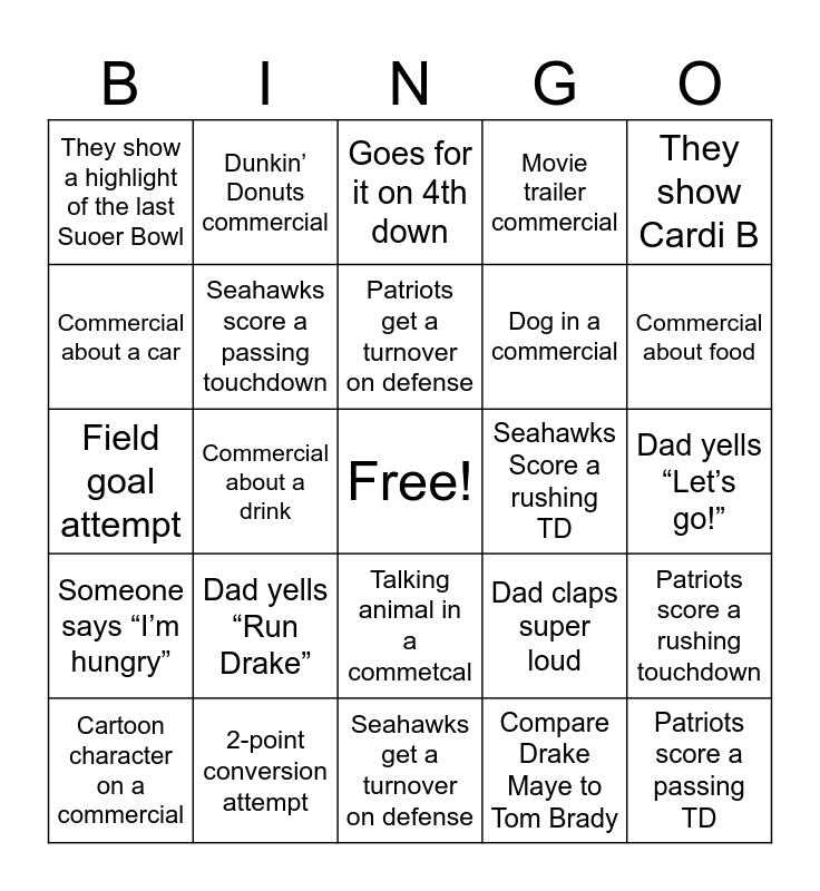 This bingo card has a free space and 24 words: Dad yells “Run Drake”, 2-point conversion attempt, Patriots get a turnover on defense, Cartoon character on a commercial, They show Cardi B, They show a highlight of the last Suoer Bowl, Commercial about a car, Dunkin’ Donuts commercial, Seahawks Score a rushing TD, Talking animal in a commetcal, Dog in a commercial, Field goal attempt, Dad claps super loud, Patriots score a rushing touchdown, Seahawks score a passing touchdown, Compare Drake Maye to Tom Brady, Dad yells “Let’s go!”, Goes for it on 4th down, Commercial about food, Commercial about a drink, Patriots score a passing TD, Someone says “I’m hungry”, Movie trailer commercial and Seahawks get a turnover on defense.