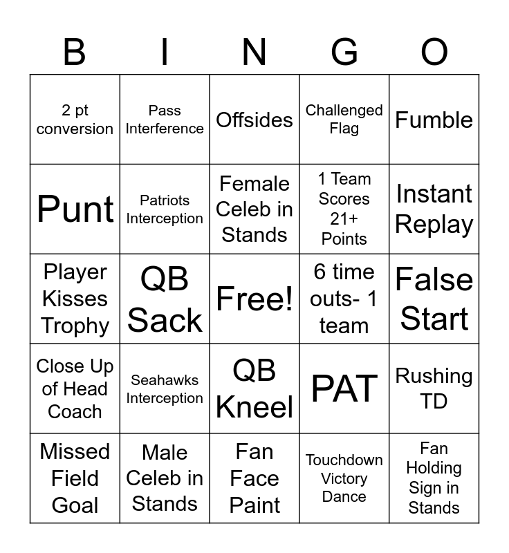 This bingo card has a free space and 24 words: Seahawks Interception, Male Celeb in Stands, Female Celeb in Stands, Missed Field Goal, Fumble, 2 pt conversion, Punt, Pass Interference, 6 time outs- 1 team, QB Kneel, 1 Team Scores 21+ Points, Player Kisses Trophy, PAT, Rushing TD, Patriots Interception, Touchdown Victory Dance, False Start, Offsides, Instant Replay, QB Sack, Fan Holding Sign in Stands, Close Up of Head Coach, Challenged Flag and Fan Face Paint.