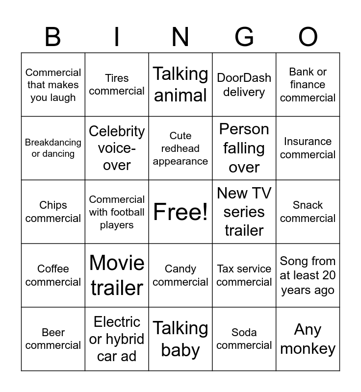 This bingo card has a free space and 29 words: Beer commercial, Fast food commercial, Commercial with football players, Ex-athlete, Commercial that makes you laugh, Talking animal, Celebrity voice-over, Movie trailer, New TV series trailer, Electric or hybrid car ad, Snack commercial, Any monkey, Talking baby, Soda commercial, Insurance commercial, Phone carrier commercial, Candy commercial, Coffee commercial, Bank or finance commercial, Chips commercial, Tax service commercial, E-commerce company ad, Person falling over, Breakdancing or dancing, DoorDash delivery, Tires commercial, Song from at least 20 years ago, Cute redhead appearance and Man’s product marketed to attract women.
