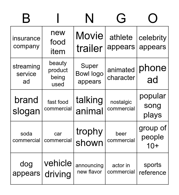 This bingo card has a free space and 24 words: car commercial, vehicle driving, Super Bowl logo appears, dog appears, celebrity appears, insurance company, streaming service ad, new food item, nostalgic commercial, trophy shown, animated character, brand slogan, beer commercial, group of people 10+, beauty product being used, actor in commercial, popular song plays, Movie trailer, phone ad, fast food commercial, sports reference, soda commercial, athlete appears and announcing new flavor.