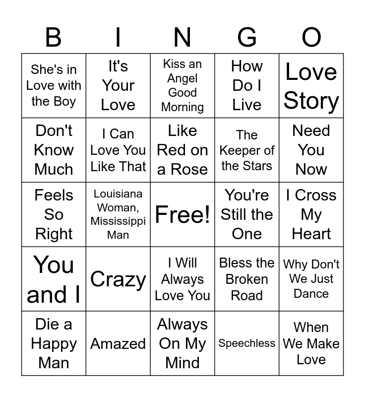 This bingo card has a free space and 43 words: In Case You Didn't Know, When We Make Love, Strawberry Wine, Die a Happy Man, Tennessee Whiskey, Speechless, Kiss an Angel Good Morning, Mama He's Crazy, Love Story, Amazed, How Do I Live, You're Still the One, I Will Always Love You, Crazy, Ring of Fire, Always On My Mind, I Swear, Feels So Right, Forever and Ever, Amen, Need You Now, It's Your Love, To Make You Feel My Love, Islands in the Stream, She's in Love with the Boy, When You Say Nothing At All, I Cross My Heart, Cowboy Take Me Away, Whenever You Come Around, Bless the Broken Road, You and I, Fishin' In the Dark, Why Don't We Just Dance, Cruise, Louisiana Woman, Mississippi Man, Lost In This Moment, She Don't Know She's Beautiful, Slow Hand, Like Red on a Rose, Don't Know Much, The Keeper of the Stars, Don't Close Your Eyes, I Can Love You Like That and Help Me Make It Through the Night.