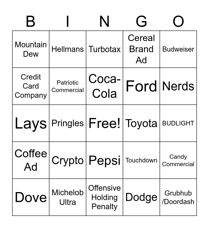 This bingo card has a free space and 40 words: Doritos, Lays, Jeep, Patriotic Commercial, Michelob Ultra, Pepsi, Coca-Cola, Uber Eats, Budweiser, Coffee Ad, Pringles, Cereal Brand Ad, Grubhub /Doordash, BUDLIGHT, Toyota, Crypto, McDonalds, Mountain Dew, Amazon, Turbotax, Candy Commercial, Dodge, Ford, Credit Card Company, Movie Ad, Square Space, Rocket Mortgage, Booking.com, Disney, Celebrity Shown, Quarterback Sack, Dove, Sports betting ad, Touchdown, Nerds, Offensive Holding Penalty, Turnover, Coors Light, Hellmans and Dumb Political BS.