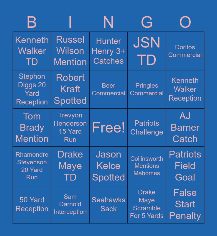 This bingo card has a free space and 24 words: Drake Maye TD, Sam Darnold Interception, Beer Commercial, 50 Yard Reception, Doritos Commercial, Kenneth Walker TD, Stephon Diggs 20 Yard Reception, Russel Wilson Mention, Patriots Challenge, Jason Kelce Spotted, Pringles Commercial, Tom Brady Mention, Collinsworth Mentions Mahomes, Patriots Field Goal, Robert Kraft Spotted, Drake Maye Scramble For 5 Yards, AJ Barner Catch, Hunter Henry 3+ Catches, Kenneth Walker Reception, Trevyon Henderson 15 Yard Run, False Start Penalty, Rhamondre Stevenson 20 Yard Run, JSN TD and Seahawks Sack.