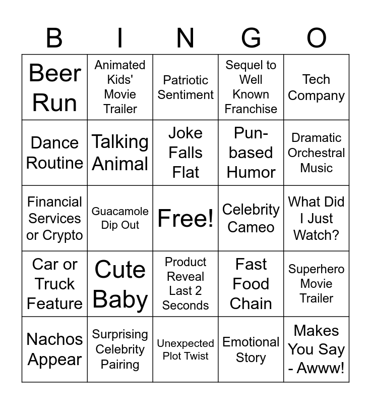 This bingo card has a free space and 29 words: Nachos Appear, Wings Eaten, Guacamole Dip Out, Pizza Delivered, Beer Run, Patriotic Sentiment, Talking Animal, Cute Baby, Celebrity Cameo, Surprising Celebrity Pairing, What Did I Just Watch?, Makes You Say - Awww!, Unexpected Plot Twist, Emotional Story, Dramatic Orchestral Music, Black & White Opening, Product Reveal Last 2 Seconds, Car or Truck Feature, Tech Company, Financial Services or Crypto, Fast Food Chain, Joke Falls Flat, Pun-based Humor, Dance Routine, Sequel to Well Known Franchise, Animated Kids' Movie Trailer, Superhero Movie Trailer, Joke Falls Flat and Talking Product.
