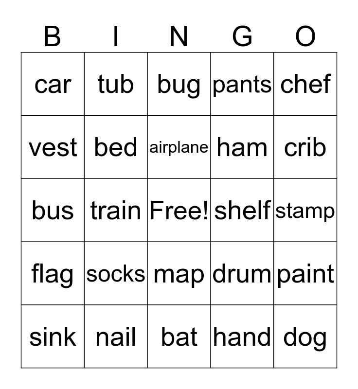 This bingo card has a free space and 24 words: socks, nail, airplane, sink, chef, car, vest, tub, shelf, map, ham, bus, drum, paint, bed, hand, stamp, bug, crib, train, dog, flag, pants and bat.