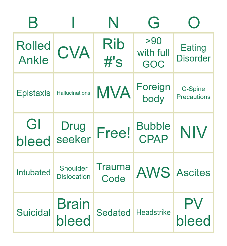 This bingo card has a free space and 29 words: Sepsis, Brain bleed, Rib #'s, MET call, Eating Disorder, Rolled Ankle, Hallucinations, MVA, Bubble CPAP, Ascites, Suicidal, Drug seeker, Headstrike, PV bleed, GI bleed, Cardiac Arrest, Sedated, AWS, C-Spine Precautions, Intubated, Shoulder Dislocation, Script Refill, Foreign body, NIV, Epistaxis, CVA, Trauma Code, >90 with full GOC and Nec Fasc.