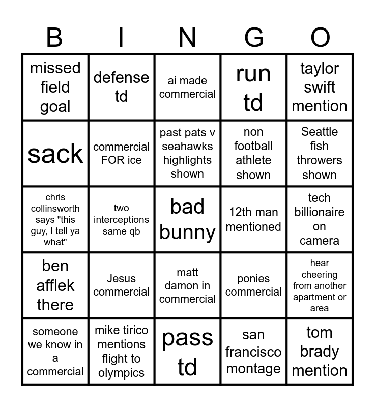 This bingo card has a free space and 29 words: someone we know in a commercial, winter urinates inside, two interceptions same qb, ryan sharts, missed field goal, ai made commercial, commercial FOR ice, Jesus commercial, 12th man mentioned, mike tirico mentions flight to olympics, tech billionaire on camera, tom brady mention, pass td, san francisco montage, Seattle fish throwers shown, green day says something epic or weird, matt damon in commercial, ben afflek there, taylor swift mention, chris collinsworth says "this guy, I tell ya what", ponies commercial, east coast snow mentioned, non football athlete shown, sack, run td, defense td, hear cheering from another apartment or area, past pats v seahawks highlights shown and REALLY funny commerial (laugh out loud for real, it's gotta really be funny. not haha funny but really funny. You have to laugh naturally, like its really funny. Otherwise it's no good for the space..